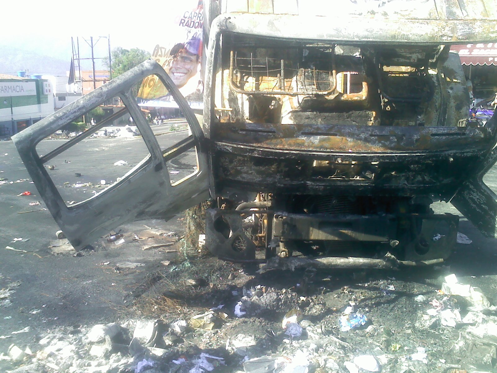 It was a year since Chavez had died. The opposition violence had started around 3 weeks ago, with blockades set up right outside our barrio, at the main intersection on our side heading to work, and along most of the main roads. They threatened people, often at gun point, if you tried to go past, and around the country had already killed quite a few. Some blockades had wire or sharp stuff to make it dangerous or fatal to motorists trying to get through. There were effigies of Chavistas hanging by the neck from the bridge further down near the market, and there were caceroles – pan bashing, at night. If you didn’t participate, as I didn’t, and were in the street going somewhere, you got verbally harassed, “Chavezista, piece of shit, get out of here, fuck off,” they said. Already, a whole family of dear friends had been beaten up for trying to clean up rubbish dumped outside the hostel. Another friend had been threatened with rape as she walked three hours to work, because the road there was unaccessible. Merida, one of the most beautiful, tranquil, green little cities in the world, was turned into a rubbish dump. It looked like a war zone, with burnt piles of rubbish, burnt tires, ripped up fences, burnt out buses, smashed in and burnt public buildings everywhere. Many shops were closed out of fear of reprisal for opening. Essential things like flour and gas couldn’t get into the city or couldn’t get to the communities. People couldn’t get to hospital, school, work. I lived near a main intersection and there were major blockades on either side of it. The violence was stressful, and feeling trapped provoked an anxiety that saw us all on edge.