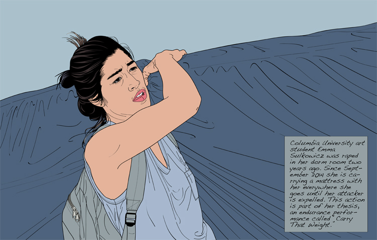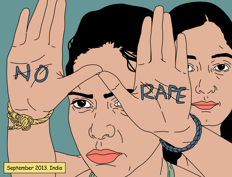 The artist, María María Acha-Kutscher, says, “The aim of the Indignadas series is to make women’s efforts more visible and place women at the center of these social struggles … The drawings show a female body not offered as support for the man’s eyes, but as support for the political message … This is another way to connect with society, by using the language of art to inmortalize these women’s actions, preserve the memory of the protest, and keep the social movements alive.”