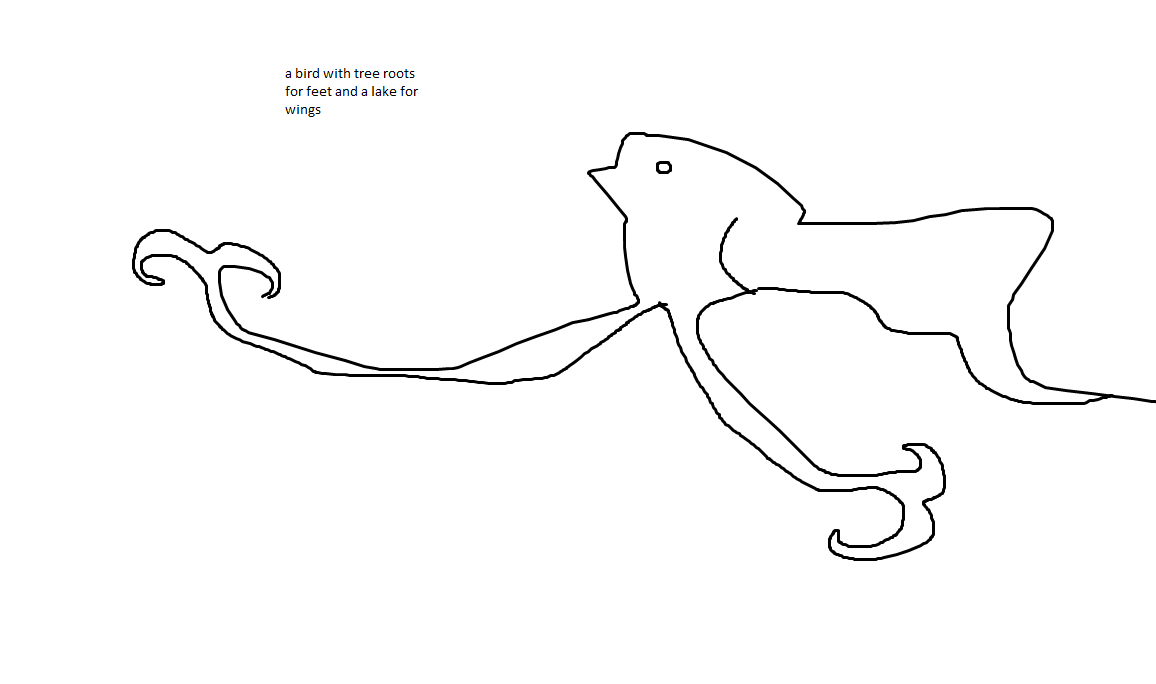 Close your eyes and draw some random lines, circles, loops, zigzags, or whatever, on a piece of paper, or using a paint program. Then, open your eyes and turn what you have into a drawing. Aim to avoid the cliches – circles are faces, squiggles are snakes – and you’ll find yourself having to invent strange creatures and worlds to make it work. Then, briefly describe what you’ve drawn, and if you want, develop those ideas further.