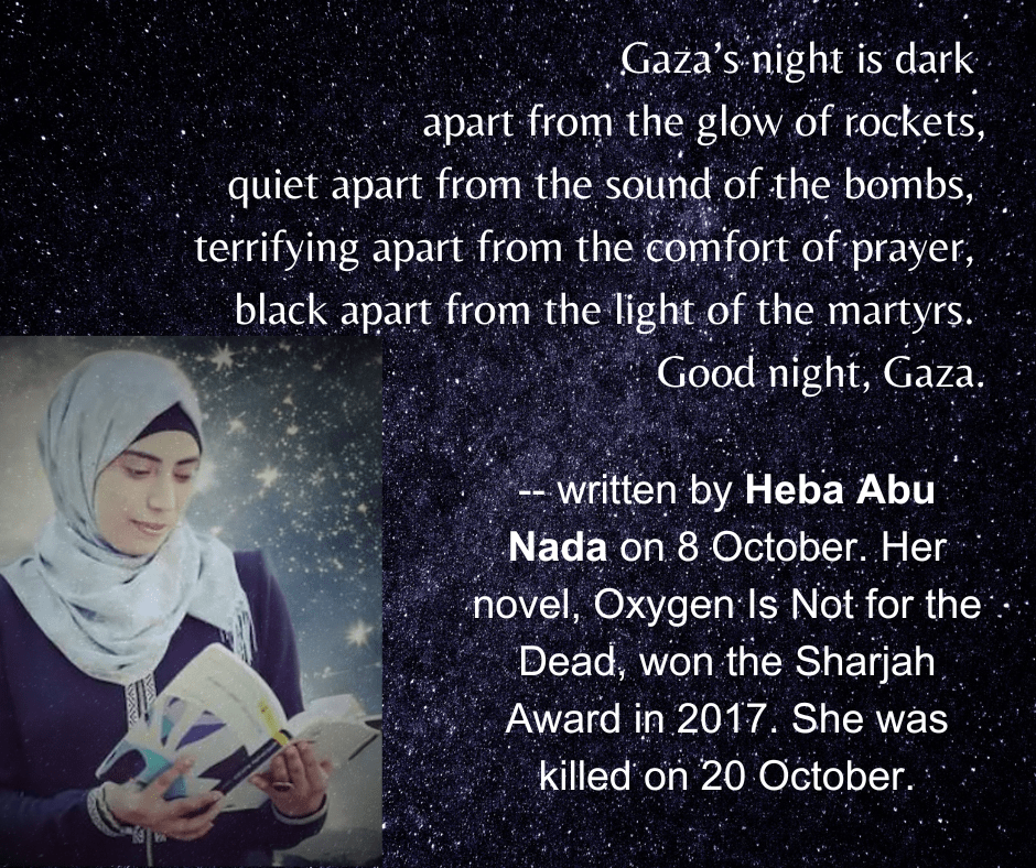 Palestinian poet and author Heba Abu Nada’s last tweet before she was killed by Israeli airstrikes.