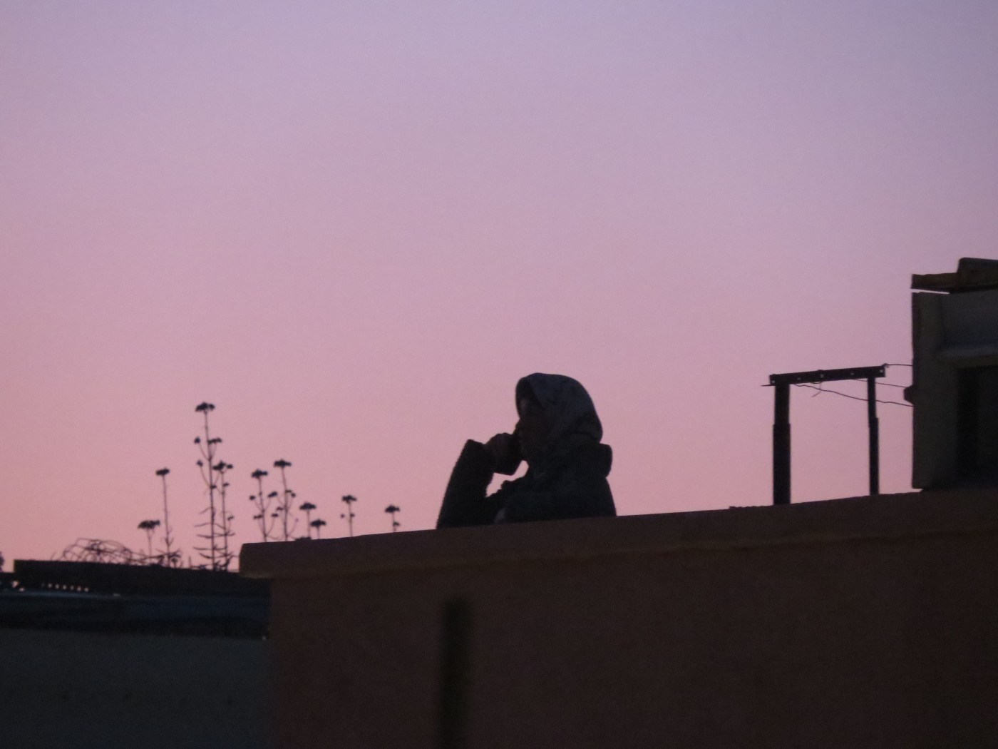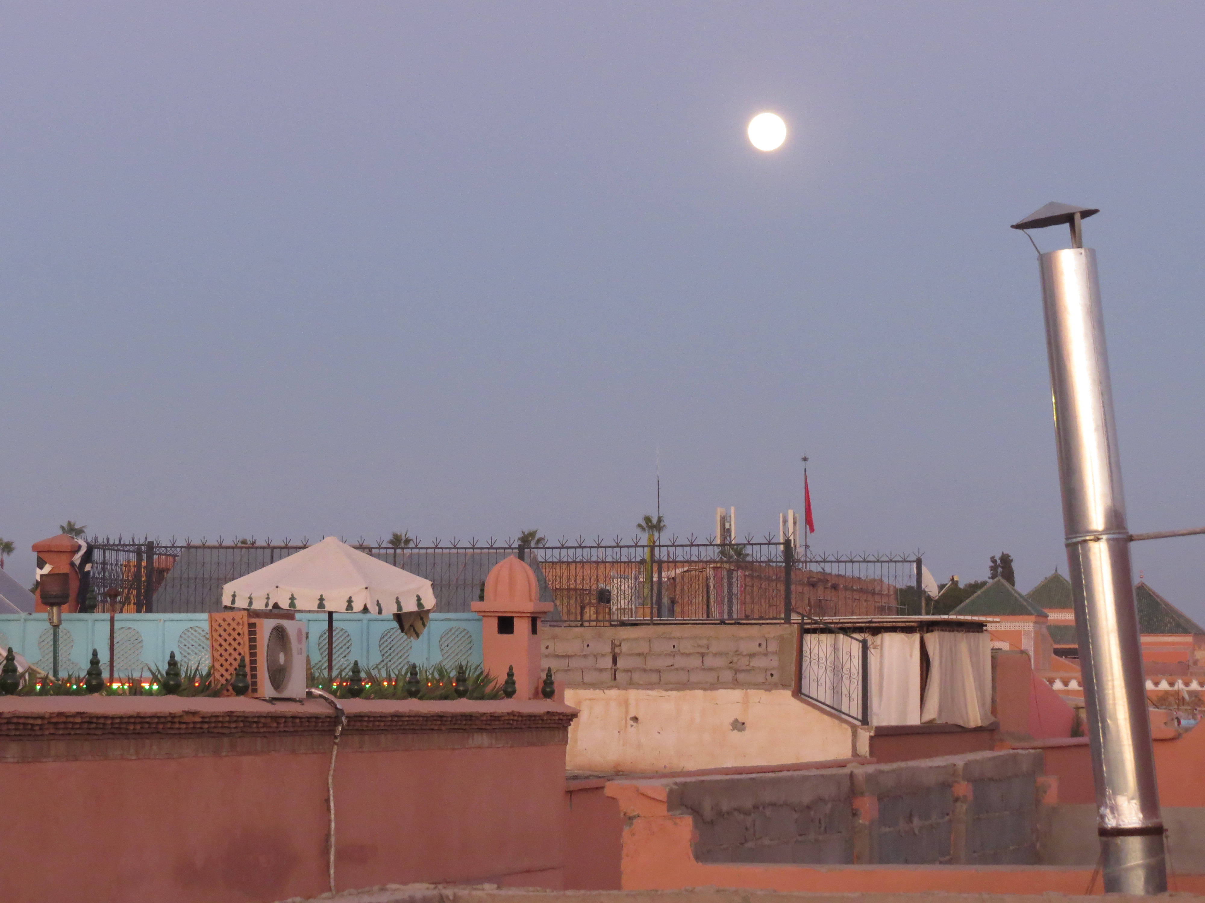 On my last day in Marrakech, I went to a cultural space to the south of the Medina. There was Saharan music at 7pm, and I got there just before and ordered some food. The sun was setting, so I went up to the roof and took photos. A woman was on another nearby roof thinking, backlit by twilight. The stained glass windows of an old building were lit up, like mellow fragments of the sunset. Behind me, a full moon watched on. Quiet, wise, bold.
