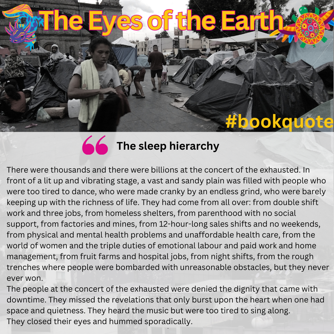 La Tortuga arrives in the surreal wreckage of Mexico City longing for just one thing; her own bed. But the concrete-skinned city is steeped in the pain of colonisation, exploitation and corruption. She must join its broken and weary inhabitants who persevere, as their culture’s vivid colours and memories infuse them all with an urge to survive.